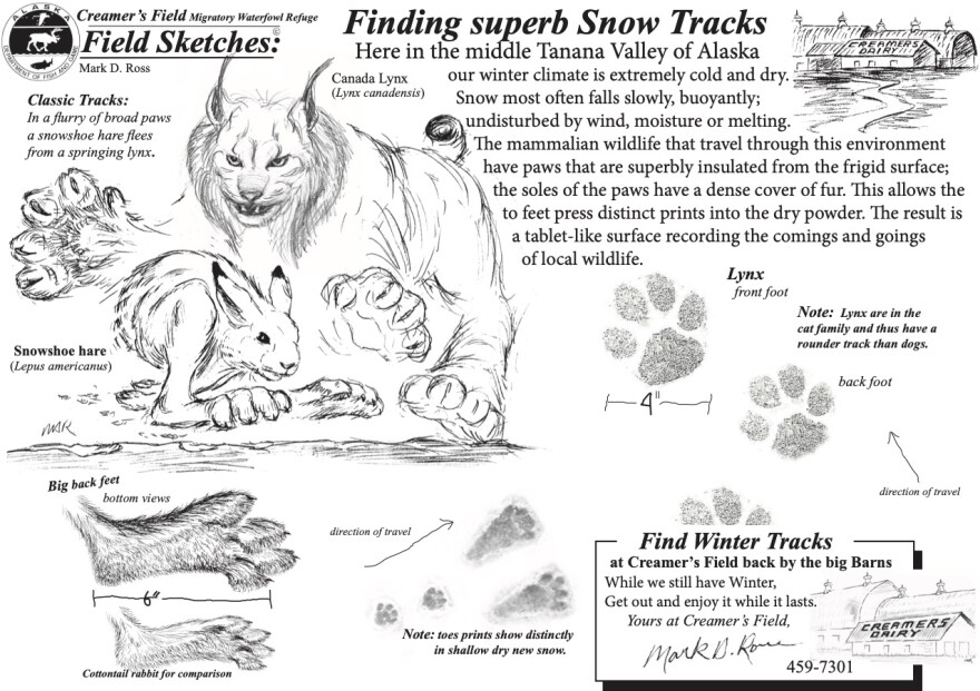 Northern Soundings Creamer's Sounds and Sights KUAC | By Robert Hannon Published March 21, 2021 at 7:43 PM AKDT Facebook Twitter LinkedIn Email Listen • 4:11 Mark Ross With all the reported sightings of lynx around Fairbanks, Creamer's Field biologist Mark Ross went in search of the elusive feline.
